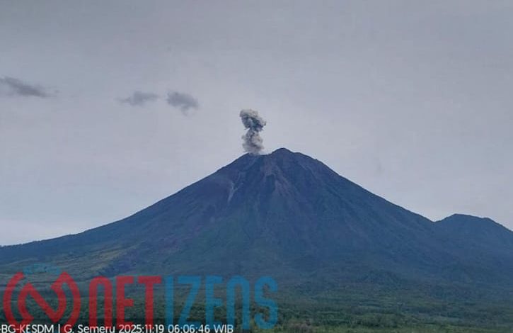 LUMAJANG, Netizens.id – Gunung Semeru di perbatasan Kabupaten Lumajang dan Malang, Jawa Timur mengalami erupsi tiga kali dengan tinggi letusan hingga 600 meter di atas puncak pada Rabu pagi (19/11/2025).