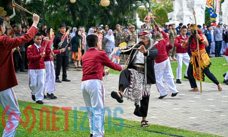 BANYUWANGI, Netizens.id – Peringatan Hari Jadi Banyuwangi (Harjaba) ke-254 yang berlangsung di halaman Kantor Bupati Banyuwangi pada Kamis (18/12/2025) dimeriahkan penampilan dramatis siswa Sekolah Rakyat Banyuwangi. Pentas drama kolosal bertema Perang Puputan Bayu berhasil menghibur para hadirin.