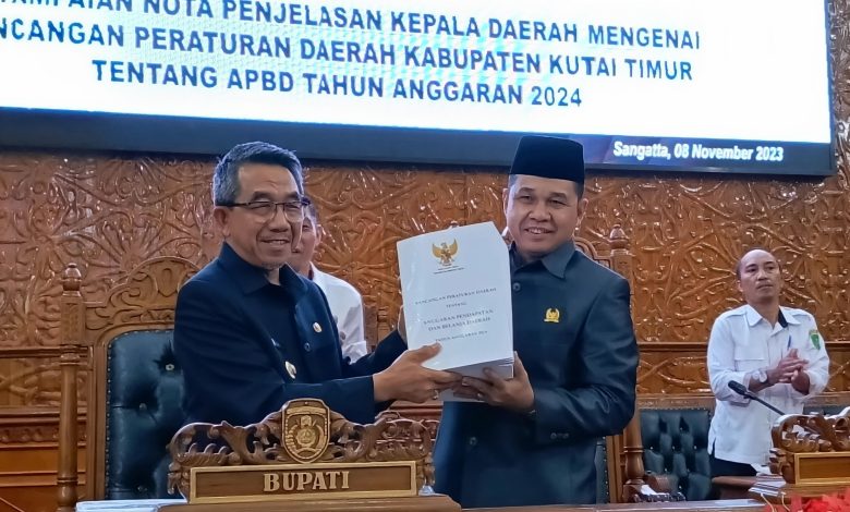 KUTAI TIMUR – Bupati Kutai Timur, Ardiansyah Sulaiman, menyampaikan Nota Keuangan Rancangan Anggaran Pendapatan dan Belanja Daerah (RAPBD) Kabupaten Kutai Timur Tahun Anggaran 2024 di hadapan Ketua dan Anggota DPRD Kabupaten Kutai Timur, serta Stakeholder terkait di Ruang Rapat Paripurna DPRD Kabupaten Kutai Timur, Senin (8/11/2023).