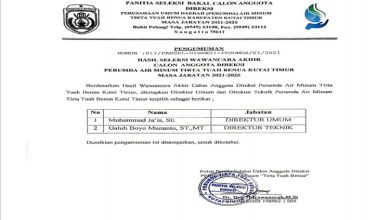KUTAI TIMUR – Setelah melalui berbagai proses penjaringan, akhirnya panitia seleksi calon anggota Direksi Perusahaan Umum Daerah Air Minum Tirta…